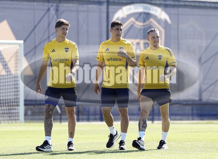 Tomas Belmonte, Miguel Merentiel y Santiago Ascacibar - Entrenamiento de Boca Juniors - Centro de Entrenamiento de Boca Juniors en Ezeiza - 21 de febrero de 2026 - Foto: Javier Garcia Martino - Prensa CABJ -