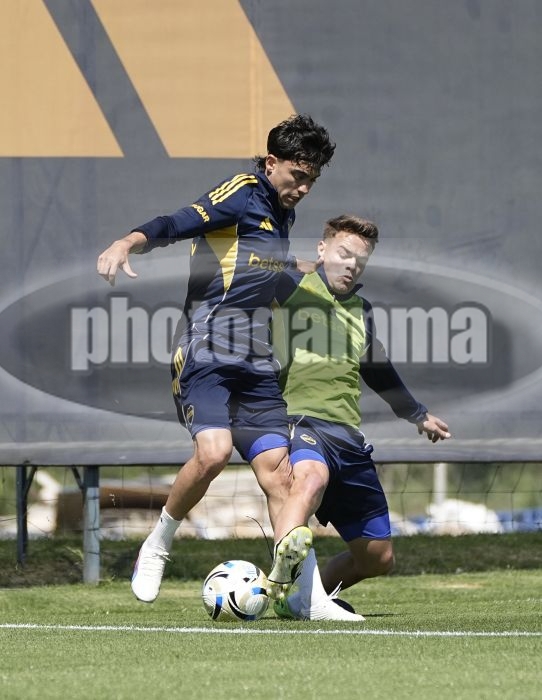 Exequiel Zeballos y Ignacio Miramon - Entrenamiento de Boca Juniors - 7 de octubre de 2025 - Centro de Entrenamiento de Boca Juniors en Ezeiza - Foto: Javier GarcĂ­a Martino - Prensa CABJ -