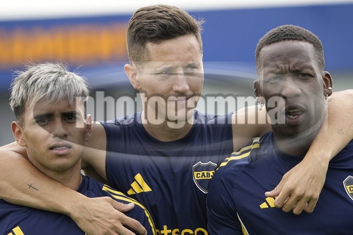 Milton Delgado, Ander Herrera y Luis Advincula - Entrenamiento de Boca Juniors - Centro de Entrenamiento de Boca Juniors en Ezeiza - 12 de noviembre de 2025 - Foto: Javier Garcia Martino - Prensa CABJ -
